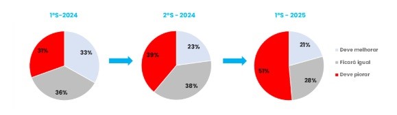 Mesmo com o otimismo para os próximos meses em seus próprios negócios, as pequenas empresas já não sentem o mesmo sobre o ambiente econômico brasileiro. A constante elevação das taxas de juros pelo Banco Central e o aumento da inflação reforçam a percepção de uma desaceleração significativa do PIB em 2025. Como reflexo desse cenário, 51% dos empreendedores preveem uma piora na economia a curto prazo – aumento em relação aos 39% registrados na sondagem de setembro. Por outro lado, apenas 21% dos entrevistados esperam uma melhora nos próximos meses.
