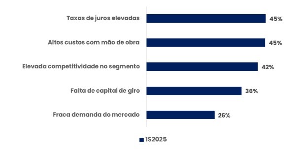 A última questão da sondagem foi direcionada a entender as principais dores dos pequenos empresários no mercado. Segundo eles, são: ‘taxas de juros elevadas’ (que aumentou de 41% dos respondentes no ano passado para 45% em 2025), seguida de ‘altos custos com mão de obra’ (que também cresceu de 41% para 45%) e ‘elevada competitividade no segmento’ (42%).